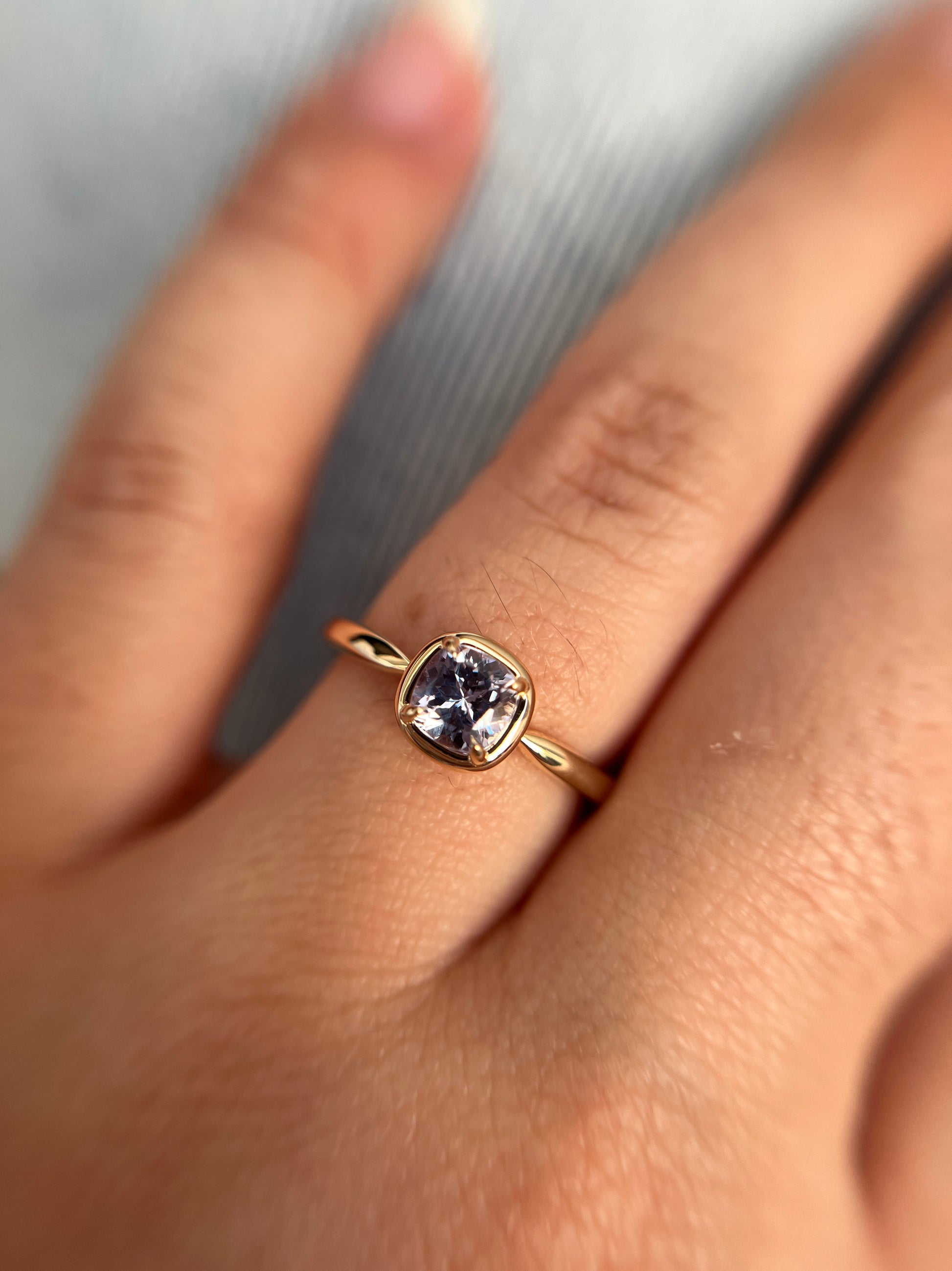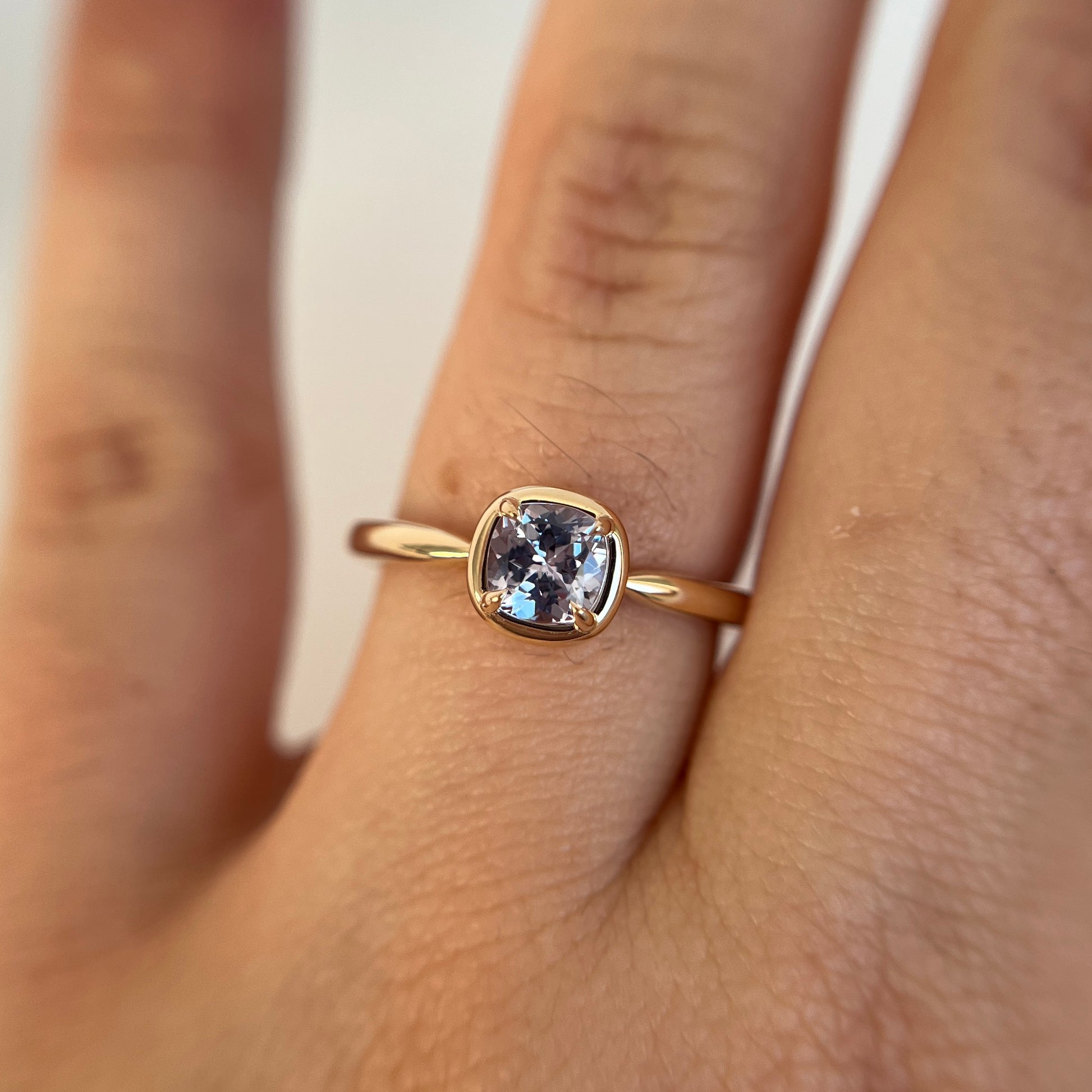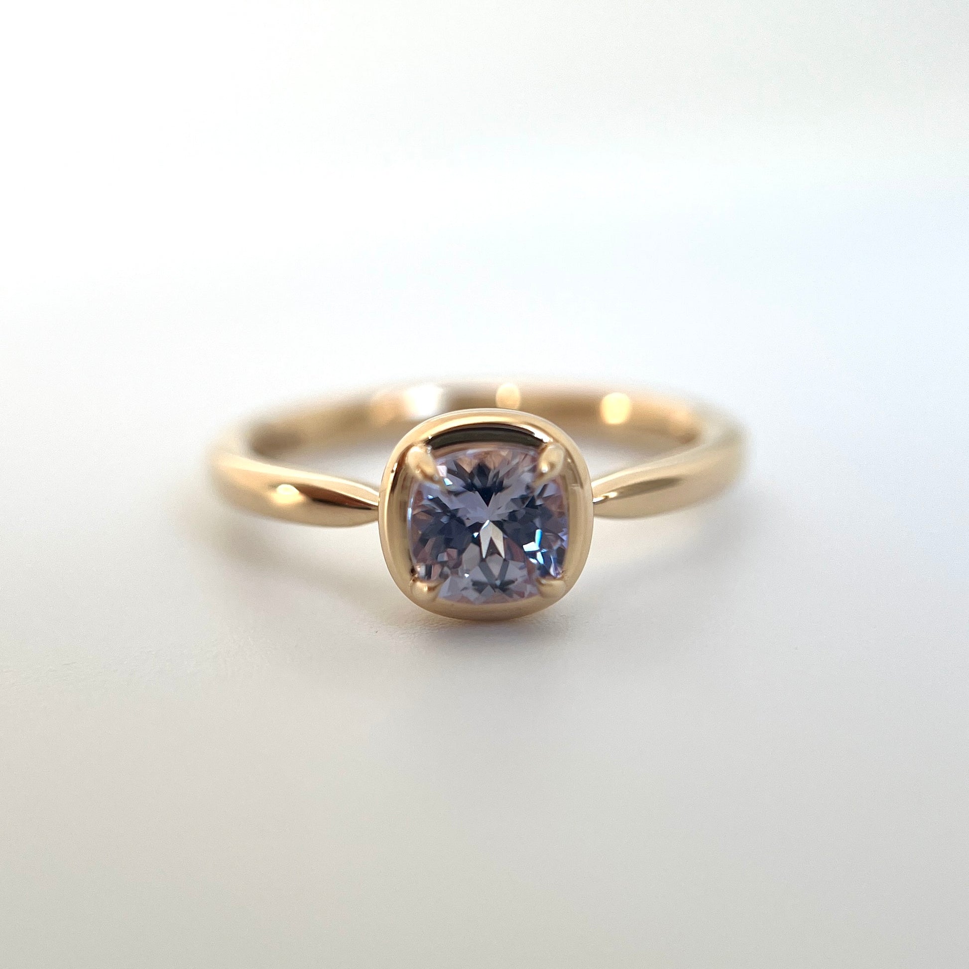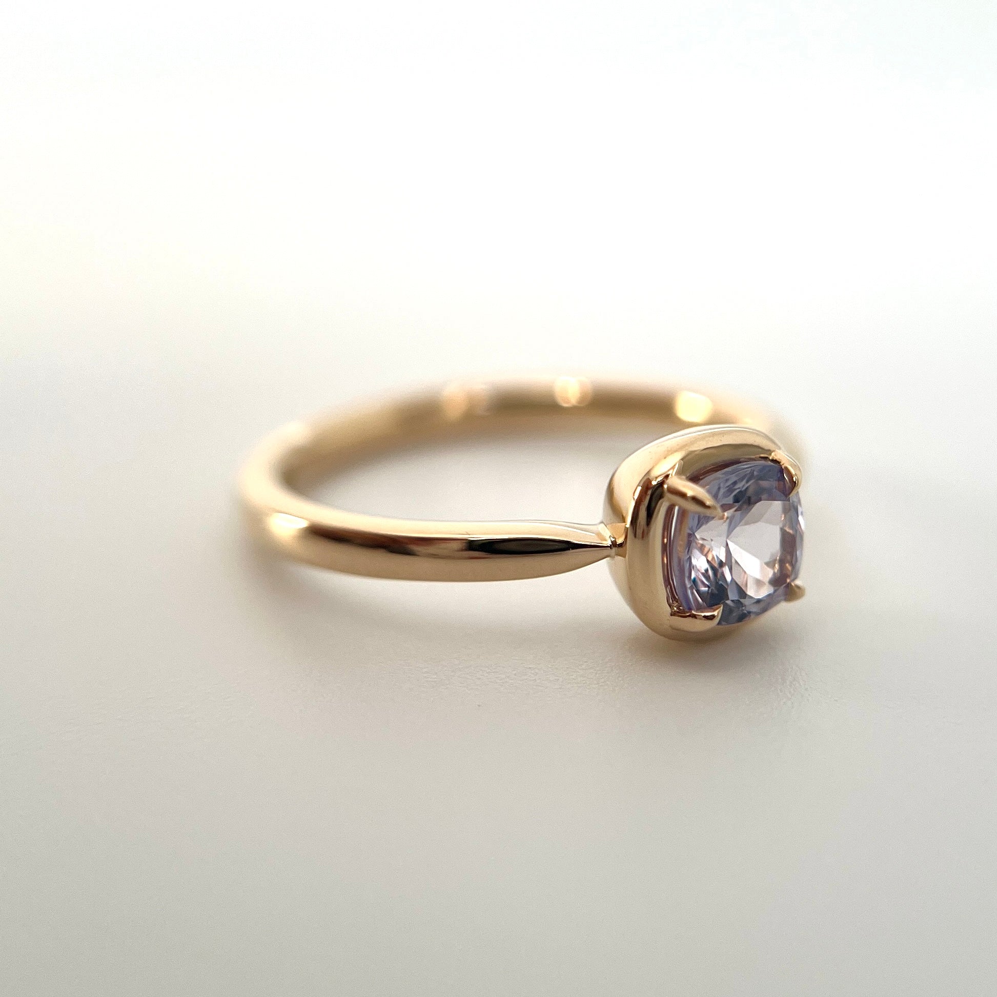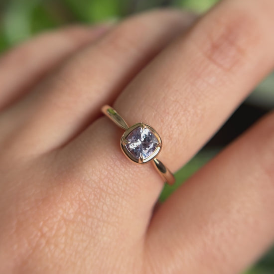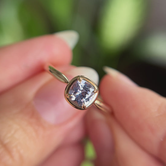 Ce solitaire est serti d’un saphir coussin carré dans une teinte violet pâle — délicate, lumineuse et tout en subtilité. La couleur est légère et apaisante, révélant de fines nuances violettes lorsque la pierre capte la lumière.