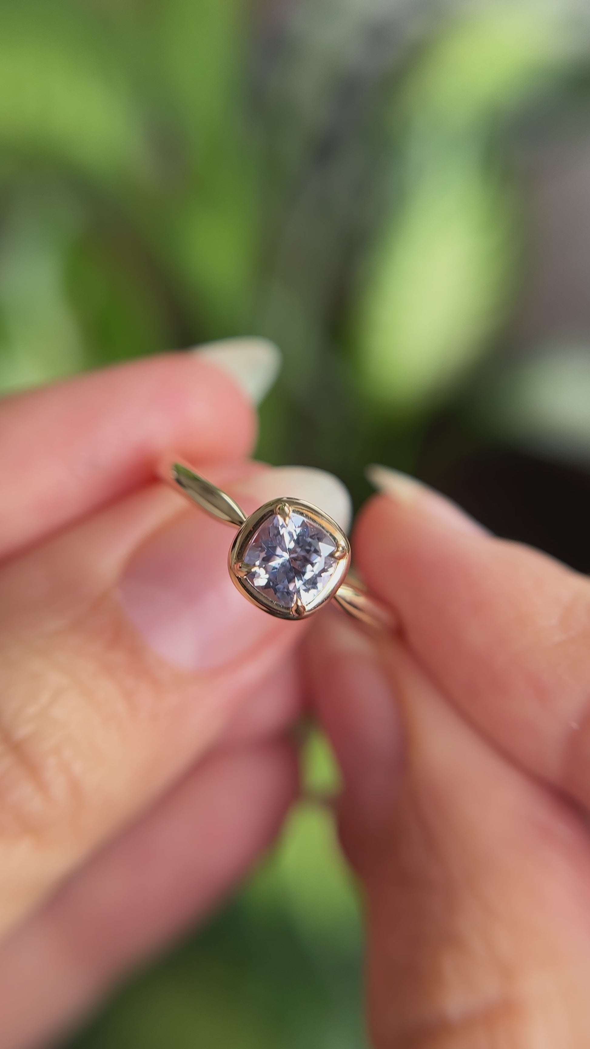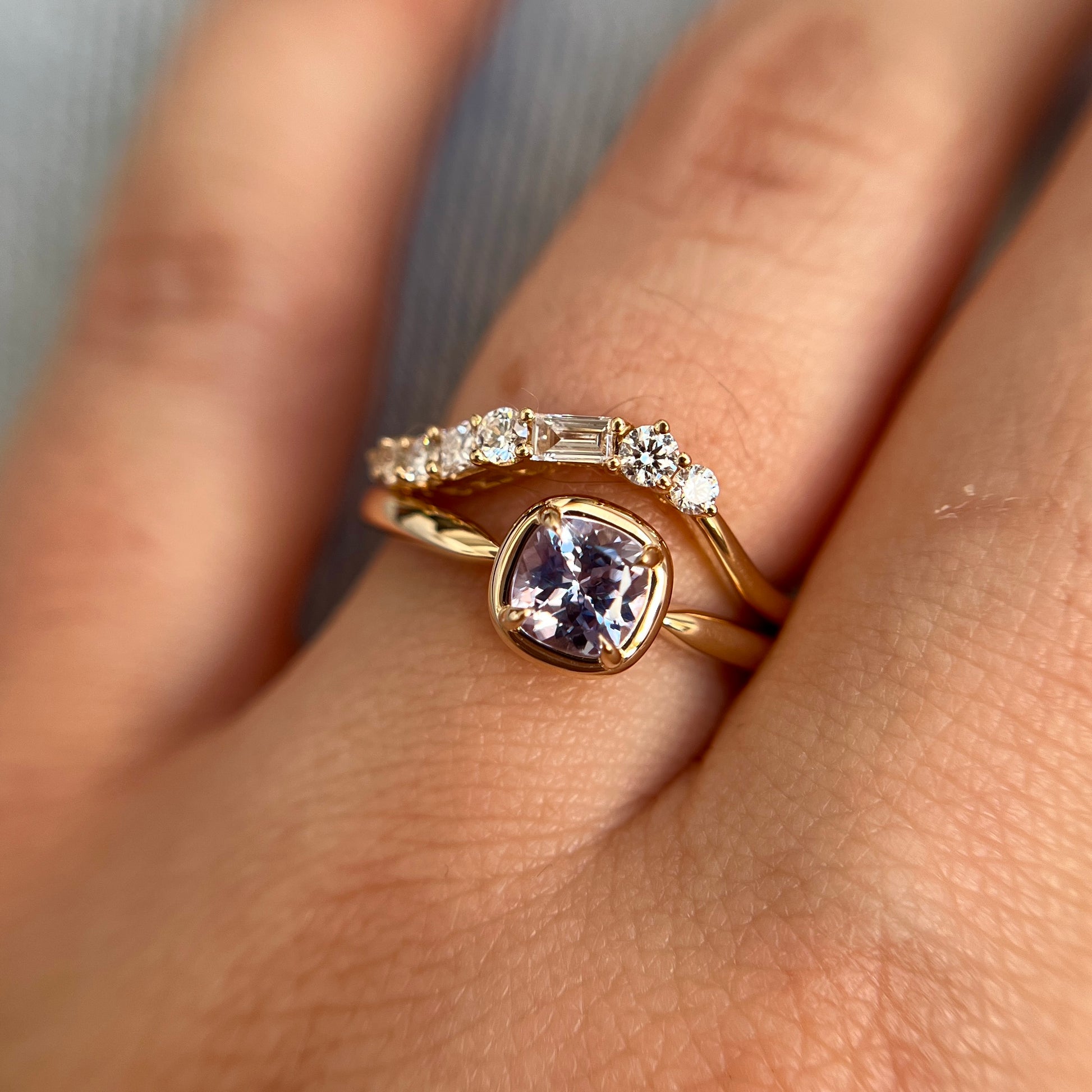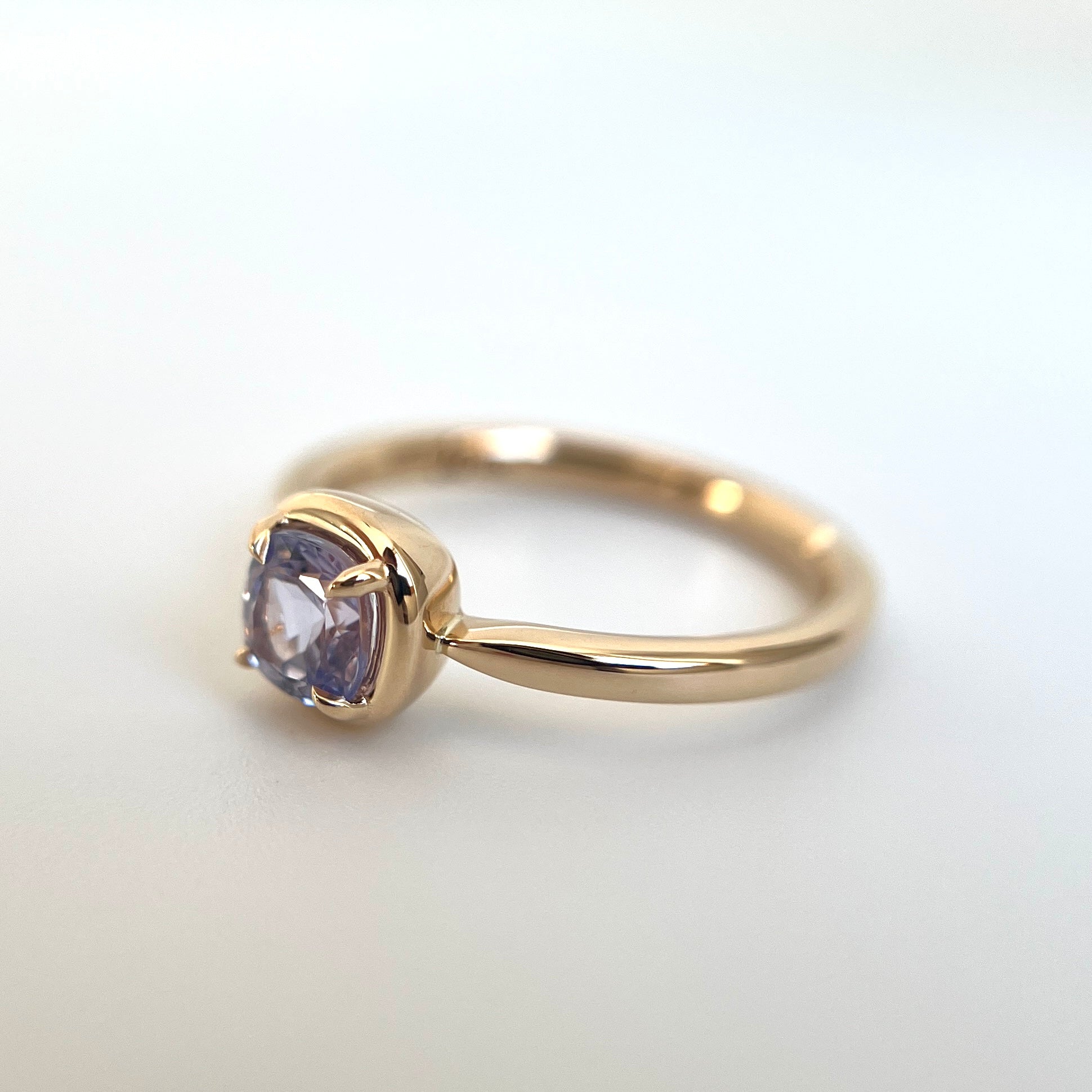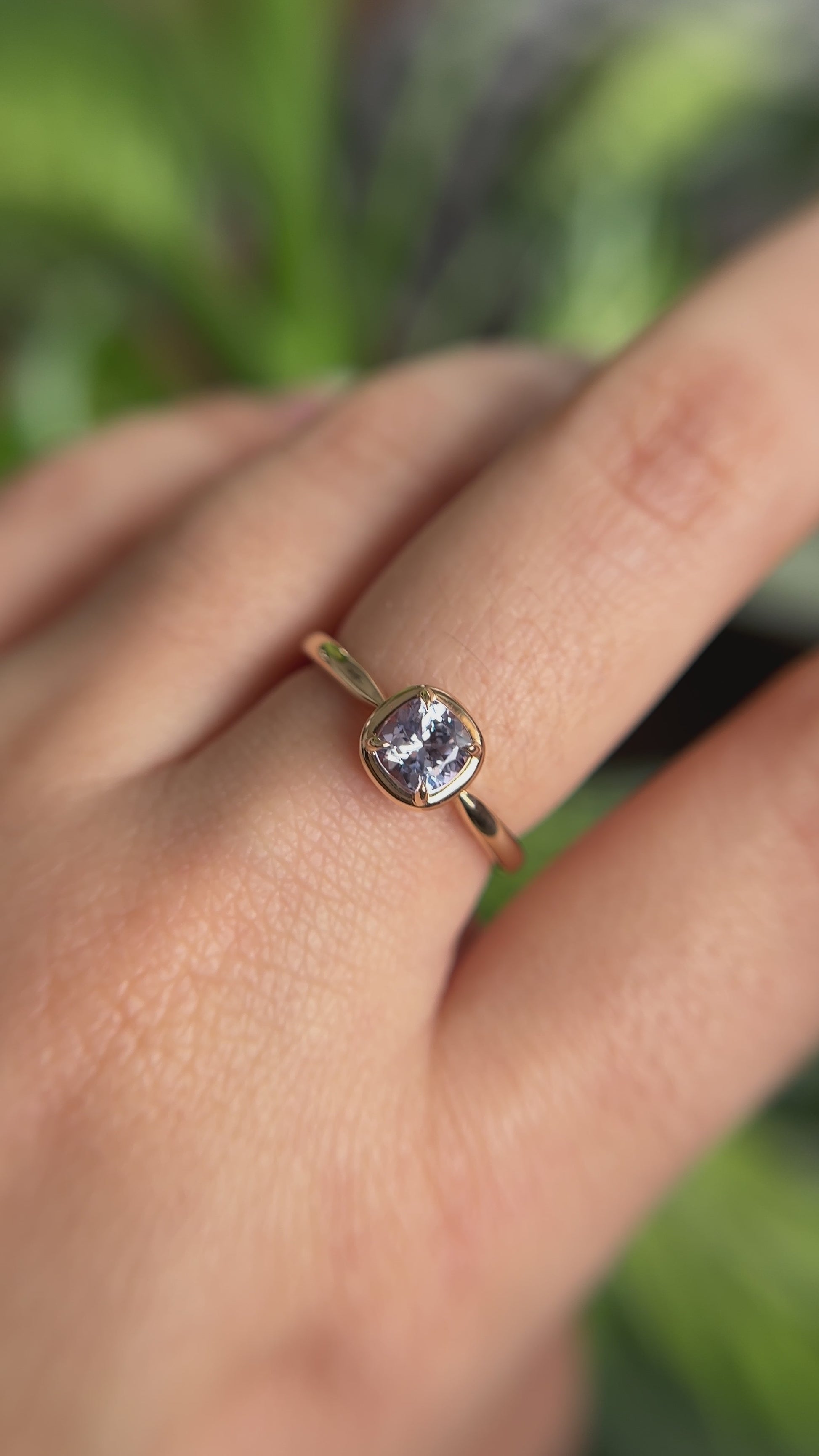 Ce solitaire est serti d’un saphir coussin carré dans une teinte violet pâle — délicate, lumineuse et tout en subtilité. La couleur est légère et apaisante, révélant de fines nuances violettes lorsque la pierre capte la lumière.