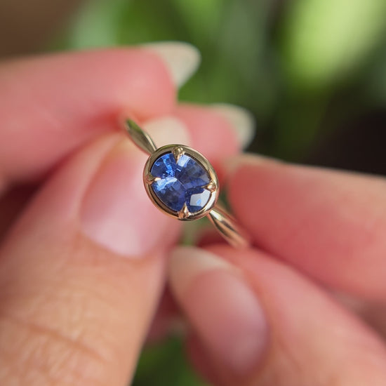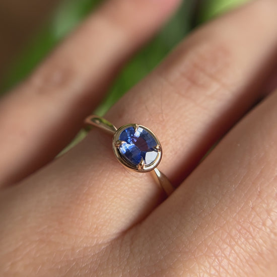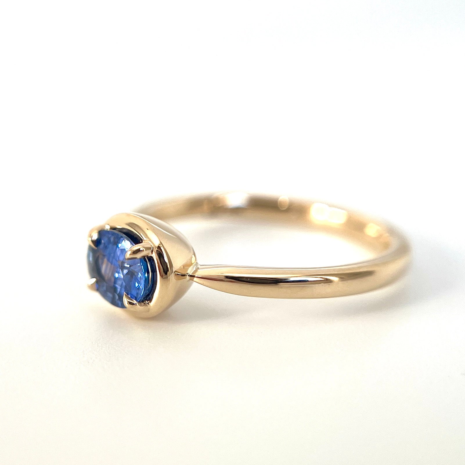 Au centre se trouve un saphir ovale bleu serti à l’horizontale, s’étendant délicatement sur le doigt pour offrir une belle présence. Le bleu royal est intemporel, mais l’orientation est-ouest lui donne une allure détendue et moderne, tout en restant élégante. Monté en or jaune 14k chaleureux, le saphir est retenu par nos griffes d’aigles signature et encadré d’un doux cadre en or qui ajoute de la présence sans alourdir le design. Rien d’extravagant, rien de surchargé. Simplement des détails réfléchis qui s’harmonisent naturellement.