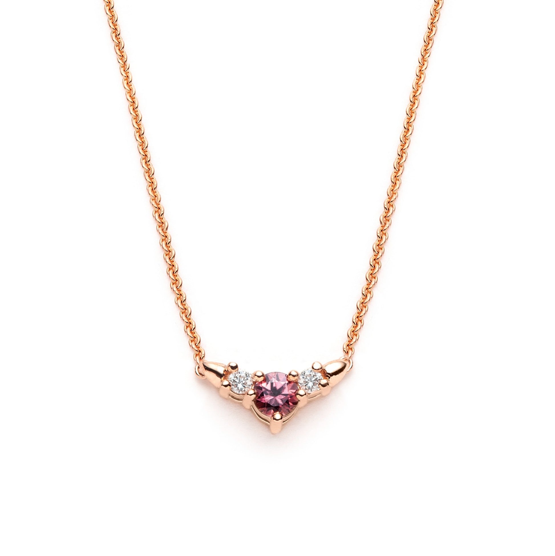 Simple, and elegant. The spikes, as we like to call them, balance out this beautiful natural pink zircon and diamond pendant. Just enough stones to keep shining on your neck, this beautiful necklace will go well with everything.